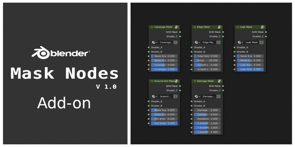 MaskNodes are custom node groups that procedurally generate black-and-white texture which can be used to add detail to your material
